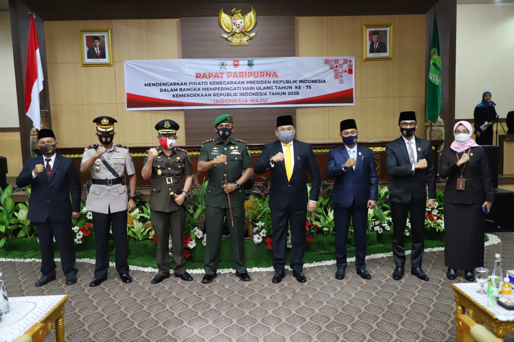 SEKAYU, – Bupati Musi Banyuasin Dr H Dodi Reza Alex Noerdin menghadiri sidang Paripurna Istimewa mendengarkan pidato Kemerdekaan oleh Presiden Republik Indonesia dalam rangka HUT Kemerdekaan RI ke-75 secara virtual, di Ruang Rapat Paripurna DPRD Muba, Jumat (14/8/2020).
